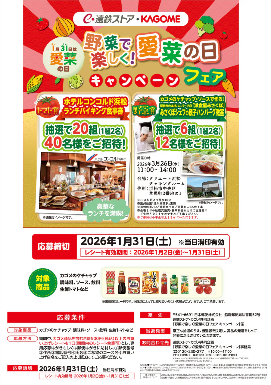 | お問い合わせ先 | 遠鉄ストア・カゴメ共同企画 「野菜で楽しく!愛菜の日フェア キャンペーン」事務局 TEL:0120-230-277 ※10:00~17:00 (土・日・祝休日 年始1月1日(木)~1月5日(月)を除く) ※本キャンペーンに関するお問い合わせは上記キャンペーン事務局のみで受け付けております。 店舗では対応できませんので、ご了承ください。 |