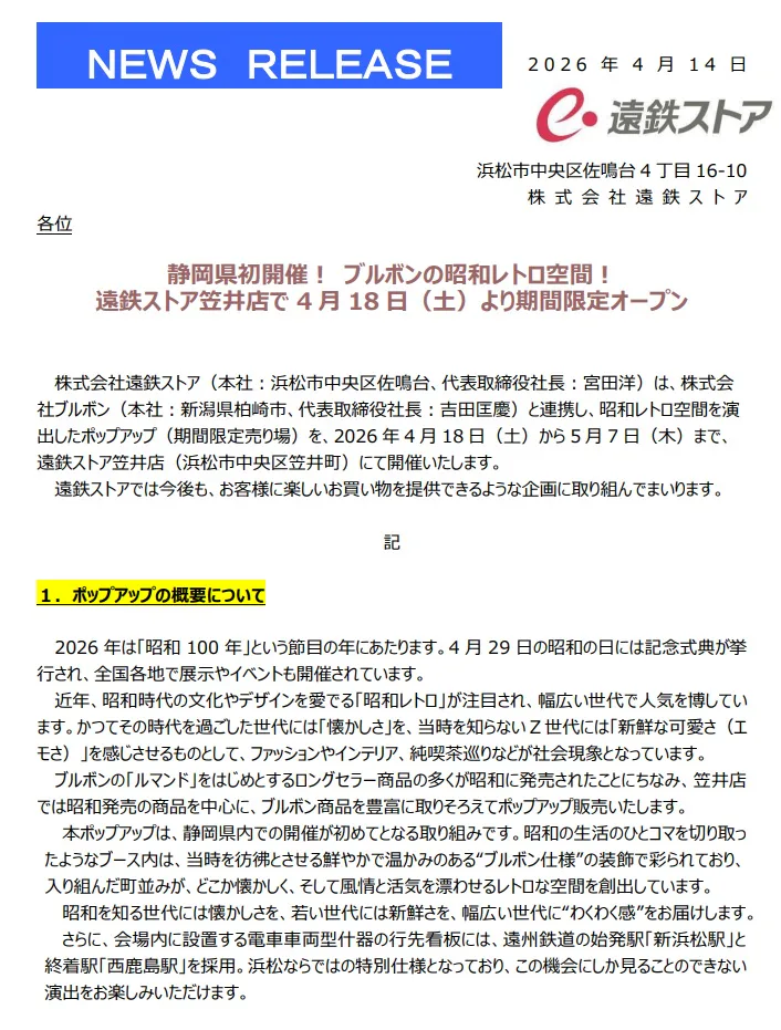 ブルボンの昭和レトロ空間!遠鉄ストア笠井店で4月18日(土)よりポップアップ開催