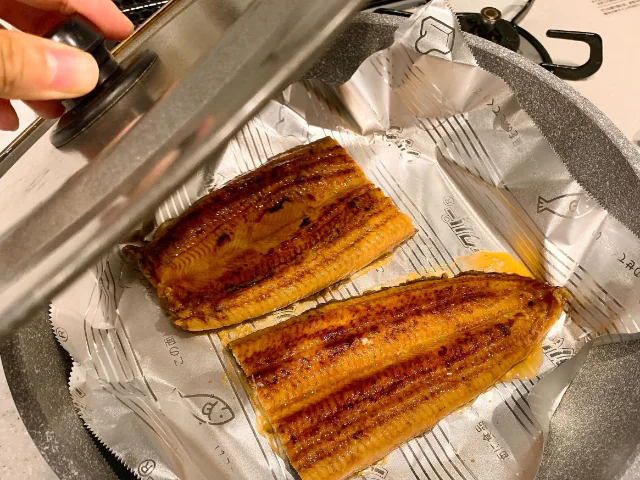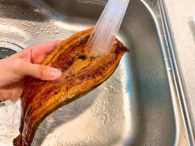 うなぎの蒲焼きを流水で洗うというと驚く方も多いかもしれませんが、表面の余分なタレを洗い流し、酒を少々ふりかけてから、フライパンで蒸し焼きにします。